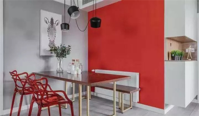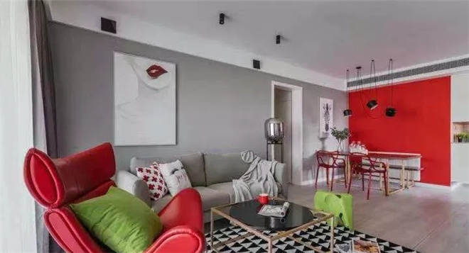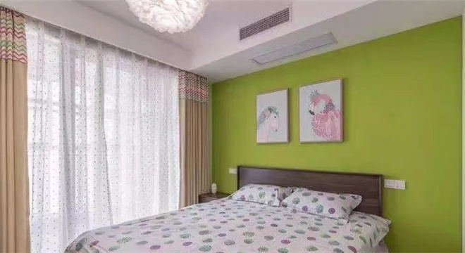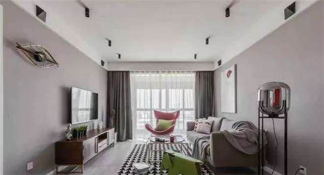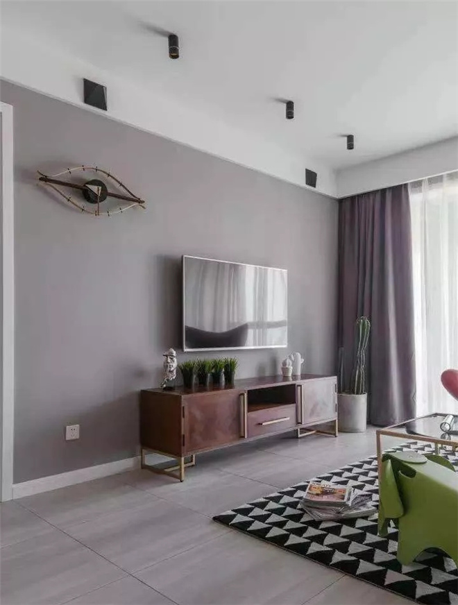 客廳是交友的娛樂中心。可以看到整體線條簡約流暢,點綴色彩對比強烈!客廳的影視墻采用的是淺色乳膠漆打底,既大方又很有氣派。喜歡北歐風格,但又不希望被單調(diào)的白色拘束,設(shè)計師最終給了小夫妻驚喜。