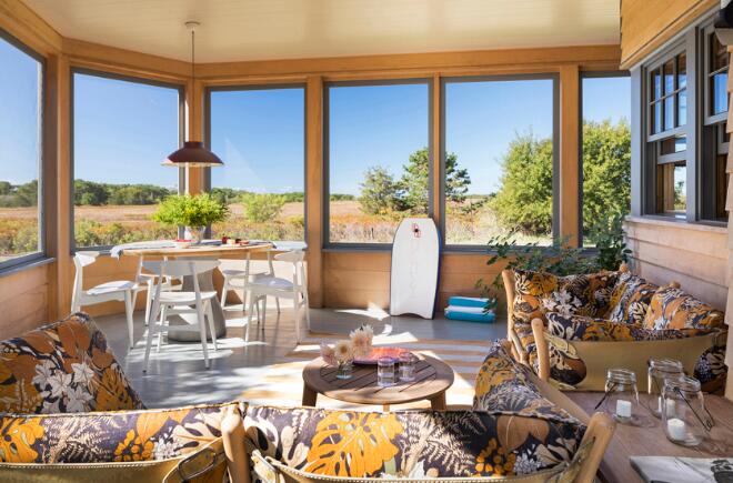 室內呈現在木頭上的中性色調,柔和的灰色和淺白色回應著溫亞德的陽光。樓層上顯眼的裝飾與室外的花園相呼應,同時柔和的色調回應了燦爛的陽光、沙灘與草地寧靜的風景。